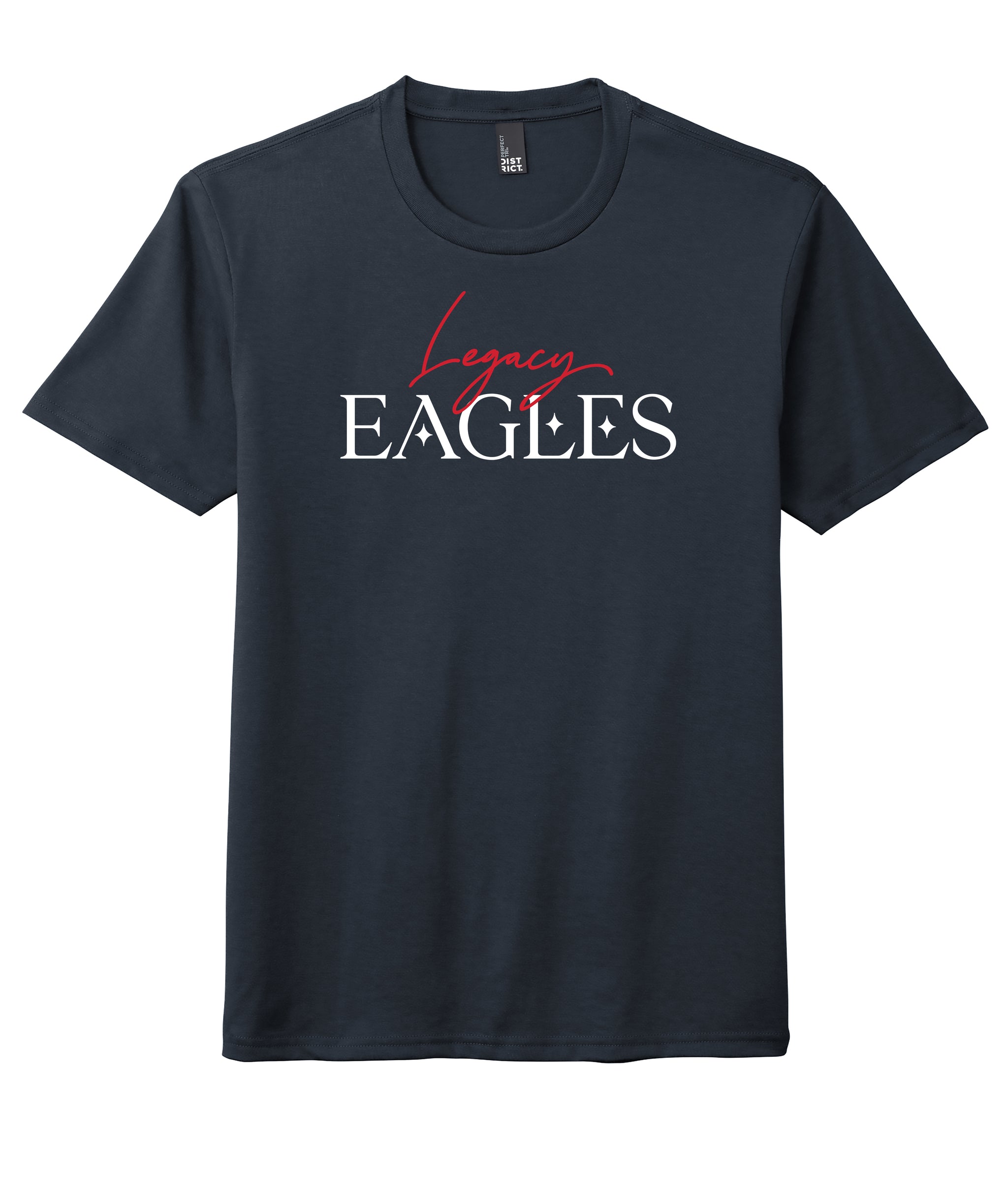 Here is a new design for 21/22 with a nice script font for Legacy and nice white font for the campus mascot, printed on a navy shirt.